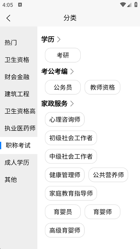 2、进入首页后您也可以在左上角点击选考试切换想要学习的板块分类;
