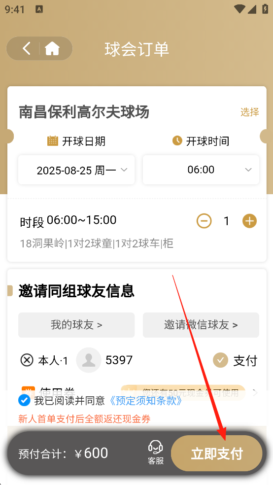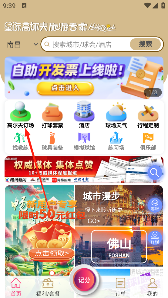 1、打开星际高球联盟App,登录之后,点击【高尔夫订场】