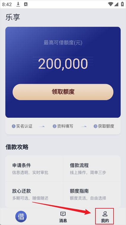 1、打开乐享借App,点击底部的“我的”进入个人中心;