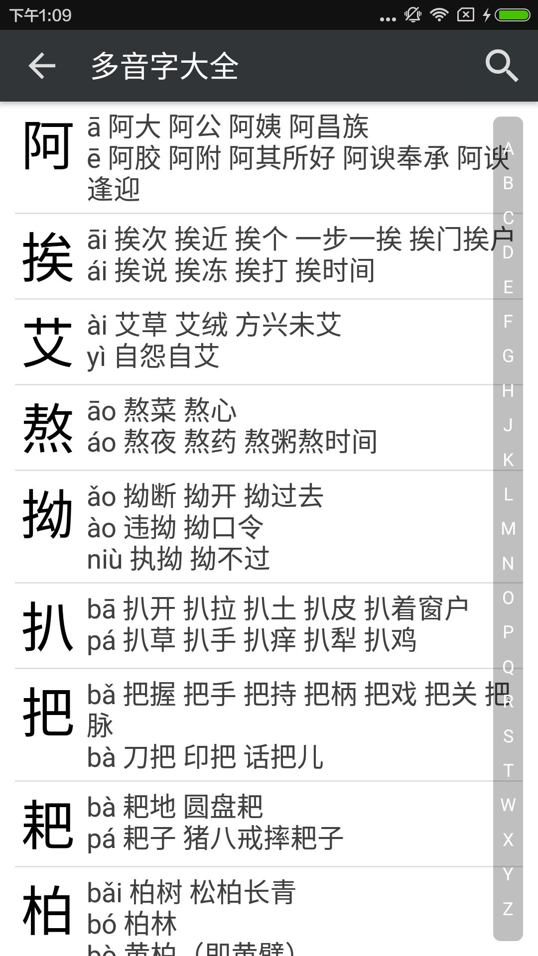 - 实现对汉字字典、多音字、词语和成语的搜索功能。