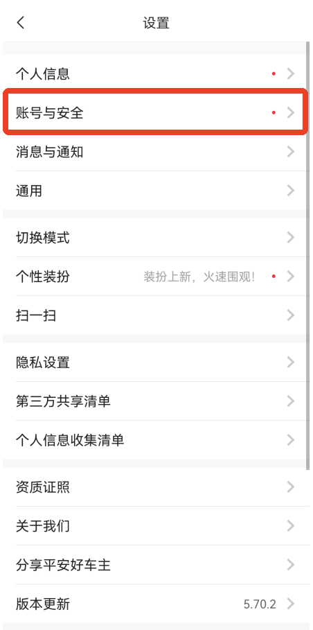 2、点击第二个【账号与安全】,可以查看账号的实名认证、手机号、密码设置和登录设备管理等等。