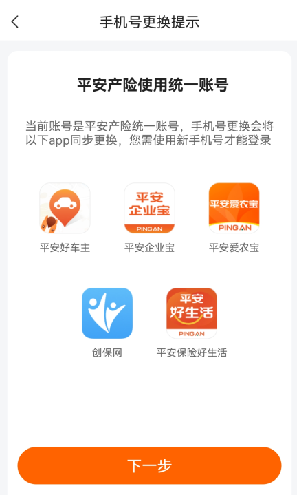 4、注意:更换手机号会同步换平安产险的其他软件,包括平安好车主、平安企业宝、平安爱农宝、创保网和平安保险好生活。
