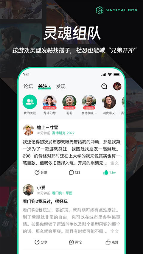 魔核App官方版还有各种趣味社区,可以在自己喜欢的游戏社区中进行分享乐趣,查找攻略,匹配玩伴等操作,还有游戏安利墙,你可以在其中看到其余玩家的游戏分享,可以帮助你解决“无游可玩”的困境。