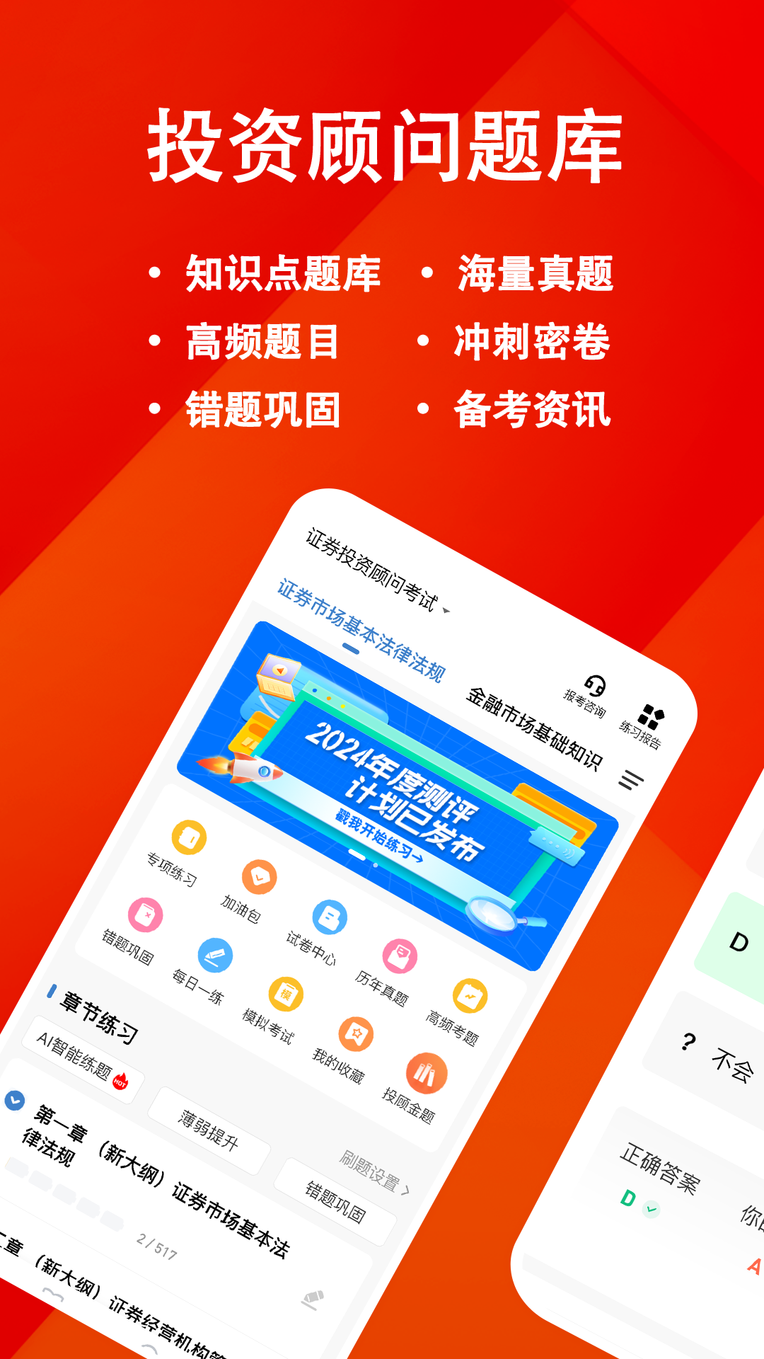 证券投资顾问练题狗是考生备考实现科目练习和模拟考试的手机端APP软件,集智能辅导、精准解析、智适应学习和考试考讯于一身的投资顾问备考掌上助手,涵盖章节练习,历年真题,预测试卷,囊括投顾考试的易考考点,包含多个专业及科目,在复习过程中查漏补缺,掌握证券投资顾问考试的重难点,提高考生的综合分析能力、拓宽知识面。