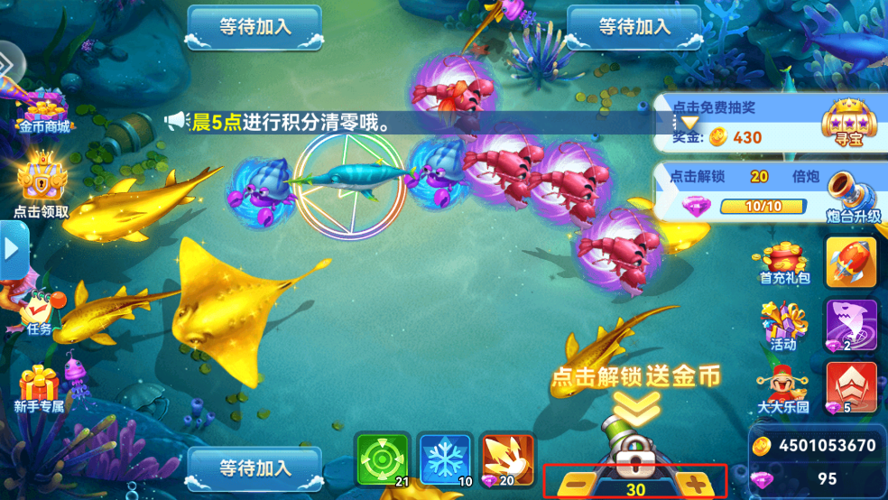 2、开炮会消耗金币,成功捕获鱼群后可获得对应数量的金币奖励。