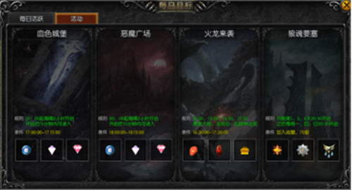 血色城堡位于冰风谷教堂,与恶魔广场类似却又并不相同。同样50级为一档,划分为九档。血色城堡是在恶魔广场之后一小时开启,同样是每两小时一场,每2小时开启一场,每场15分钟,一天总开启12场,23:00开启最后一场后结束。