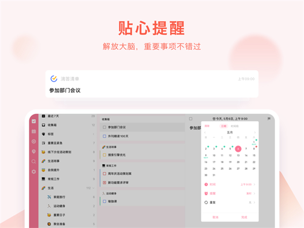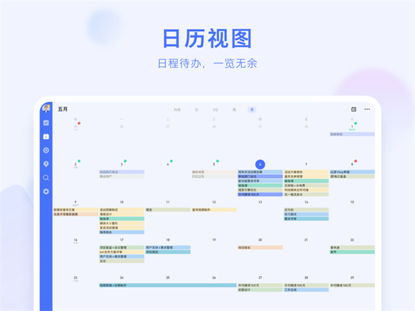 - 月视图自由缩放:支持双指放大月视图,轻松查看某段时间的更多任务,浏览更灵活,操作更高效。