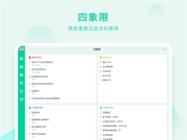 滴答清单ipad是一款专为苹果iPad设备打造的日程管理应用。软件界面设计简洁,操作简便,功能强大,能为用户提供制定工作计划,设置会议提醒, 安排行程规划,整理购物清单等功能。通过软件,用户不仅可以方便的在日历中查看每一天的日常安排,还可以为任务设置日期和提醒,让你确保不会错过任何重要的事情。滴答清单ipad版还支持添加清单和文件夹来管理任务,你可以通过标签来进行分类,同时还可以设置优先级区分任务的重要程度。