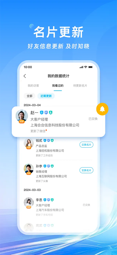 名片联系人的公司职位联系方式有更新时,即时给您发送提醒,让您可以及时送出祝贺,保持人脉新鲜。
