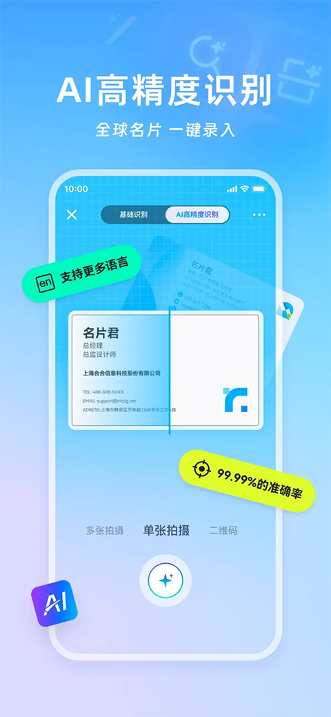 - 支持多拍、批量等所有扫描场景的 AI 高精度识别,自动录入名片信息,告别繁琐的人工校对,效率倍增。