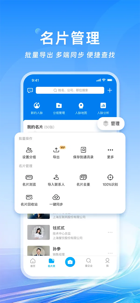 销售/采购:名片识别率高,瞬间保存销售线索,结识潜力客户,名片全能王帮我获得更多商机更多业绩。