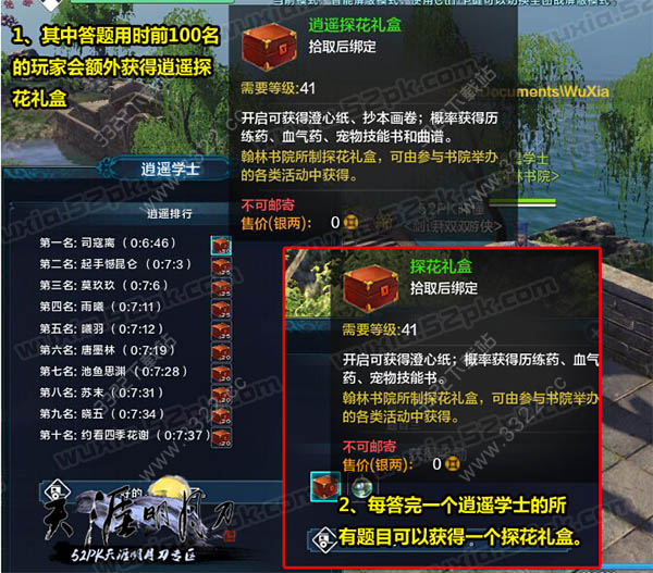 其中在答题过程中,玩家每完成一个学士的所有答题,即可获得探花礼盒(其中1-5号学士是3个题目一轮;6-10号学士是4个题目一轮;11-15号学士是5个题目一轮)。而最终用时排名前100的玩家还可获得逍遥探花礼盒。这两种礼盒奖励基本类似。可以开出文士创作抄录所用到的纸张。同时还能概率获得历练药、宠物技能书、曲谱等等。