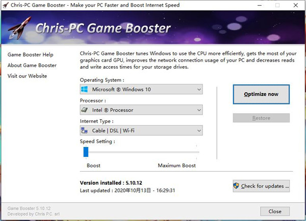 Chris-PC Game Booster是一款功能齐全的游戏性能优化软件。它并不是齿轮加速,它能获取到本地电脑的硬件信息,然后通过提高CPU、显卡和网络的性能来提高游戏的帧数和网速,至于你想提高多少,是可以自定义的,只需要一键就能达到你想要的效果;Chris-PC Game Booster主要通过修改处理器、修改启动、修改网络类型三种方式优化你的电脑,你需要知道这三个参数的意思才能调试电脑环境,从而提升电脑性能,优化应用程序启动速度,避免在玩游戏的时候出现延迟;如果你不满意Chris-PC Game Booster所做的修改,您可以随时按下恢复按钮,它会撤消它所做的任何更改,将其运送至原来的推荐值,有兴趣的小伙伴快来下载体验吧!