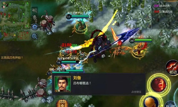 三英阵容打法:首先还是迅速出装,各处箱子中的物品不要忘记去捡。一开始浦沅夏侯跟随刘备攻破第一个敌方据点,而关羽在上面打树人升级,张飞在下面打旗子发育。期间叛军首领会掉落关羽专属武器,不占格子。接着第二个据点,击杀朱俊张飞的专属武器掉落。关羽发育完之后前去跟大家会合推据点堵门防守,张飞则是负责击杀版军首领,何进,斗魔,之后再和队伍会合。