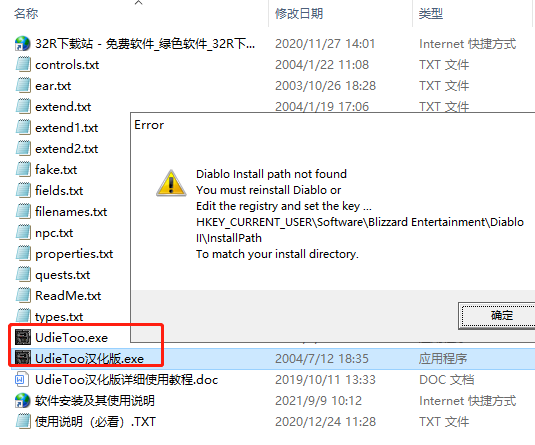 1、在本站下载解压,得到udietoo暗黑2万能修改器中文版,首先你要在电脑上安装好了暗黑破坏神1.10以上版本,没有安装会弹出以下窗口;