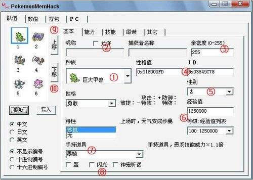 包括基本的种族、性格、手持道具、等级、经验、能力、技能、缎带、宠物球等