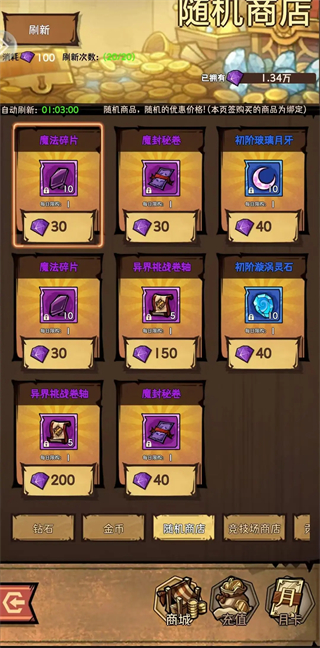 这里还要强调一下,商城金币区,除了魔法刻印卷轴,能买的都买;随机商店里晋升突破石(这个是重点,后期很缺,除非你拿钻石买),古老的宝藏钥匙,魔封秘卷,异界挑战都是需要买的,如果你开了月卡交易,解绑卷也是必买的。
