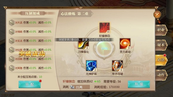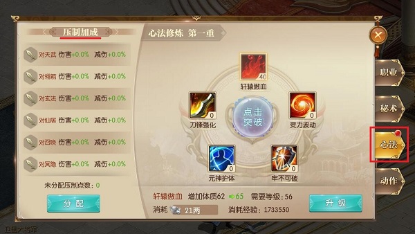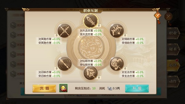 2、心法修炼突破后增加可分配的压制加成点数,通过使用点数在职业压制界面中,升级压制加成等级。