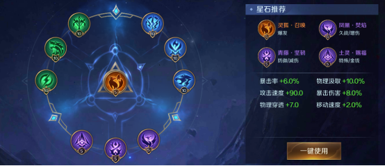 蓝绿星石主要是法术穿透、法术汲取和冷却缩减为主。紫色星石推荐蛟龙,青藤,土灵,提升持续作战能力续航,橙色星石选择猎隼,加强其爆发输出能力。