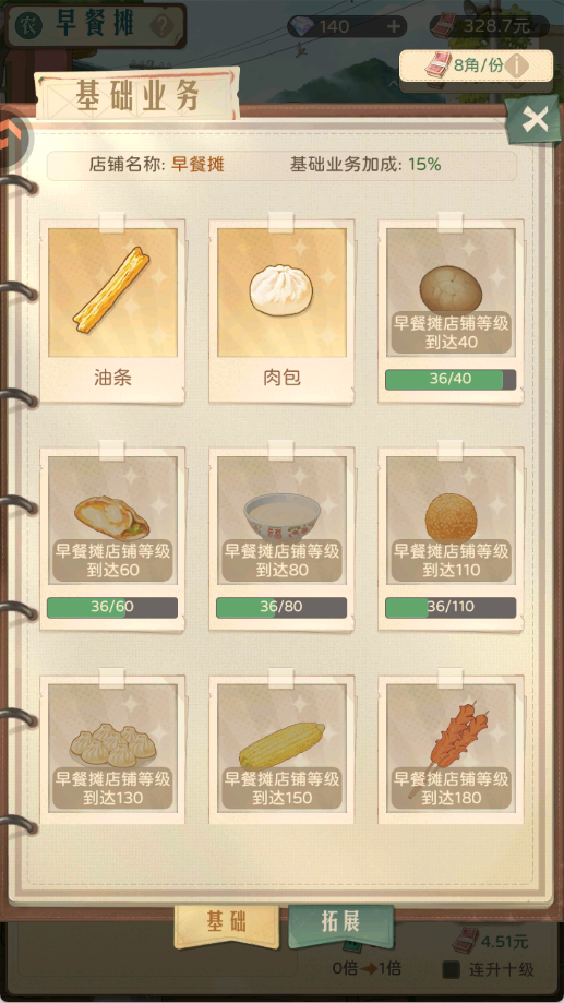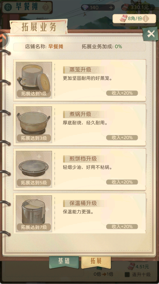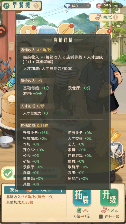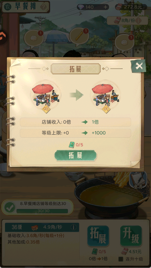 1、消耗致富经,可提升店铺拓展等级、解锁拓展业务,大幅提升店铺收入。