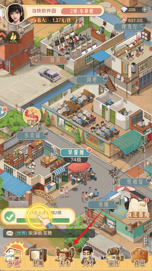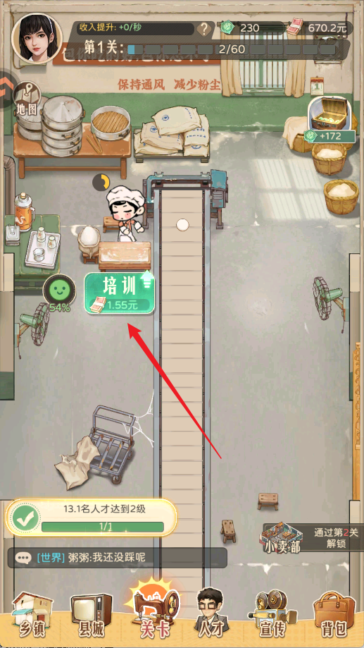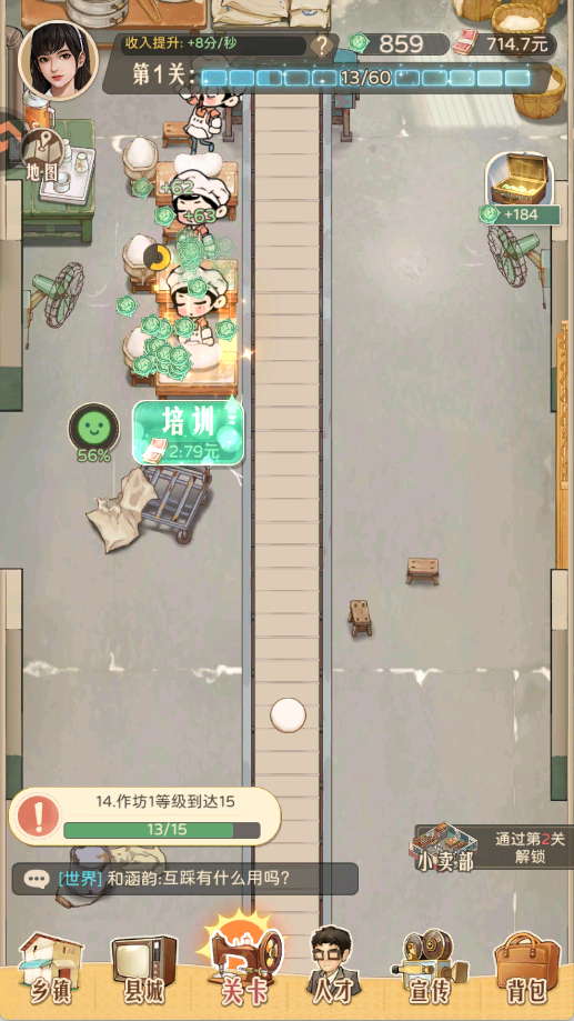 关卡位于游戏正下方,进入关卡后,完成招工——培训——与奸商对决,即为通关,总的来说类似于做游戏内的主线任务,跟随主线一路推关。