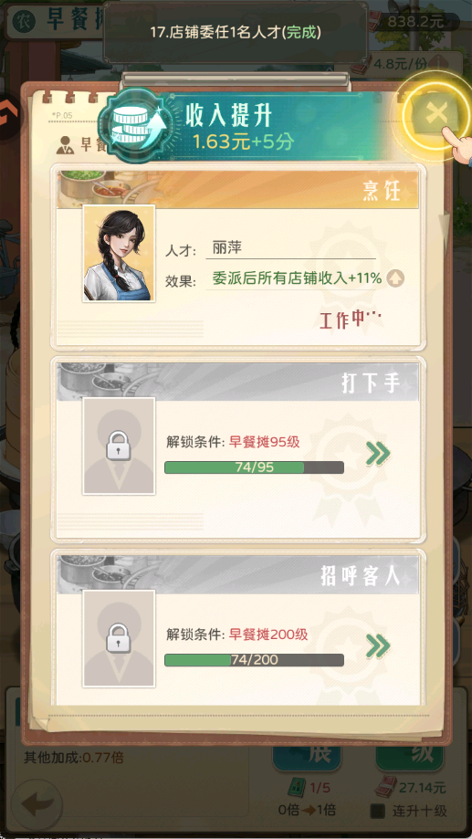 通过激励可以提高关卡内员工们的工作效率,在未来240分钟内提高收入。