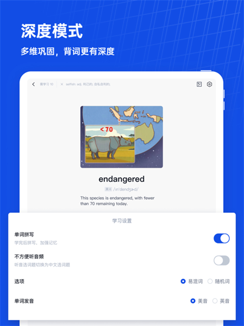 为了让用户掌握单词更加全面,百词斩iPad版采用多样化复习,加上词汇拼写搭配功能,看看单词的运用能力,让每一位学习者都不在害怕英语。有了百词斩,一刀斩断与英语的那么多年的恩怨。