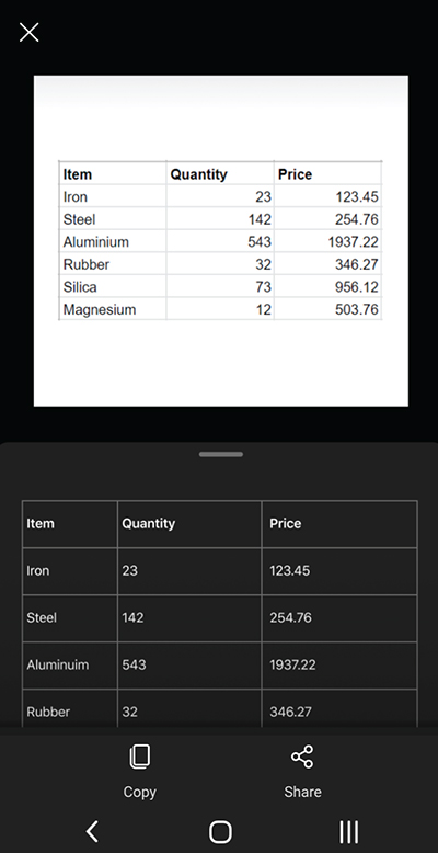若要从图像中提取表格,请选择"表格"模式,将相机指向要捕获的表格,然后点击圆形"相机"按钮。 接下来,通过调整图像的边框来定位表格,然后点击屏幕右下角的"继续"。 如果要重新拍摄图像,请点击屏幕右下角的"重新拍摄"。 点击"继续" Microsoft Lens 从图像中提取表并显示在屏幕上。 现在,可以在Android 设备上的其他任何应用中复制并共享该表。