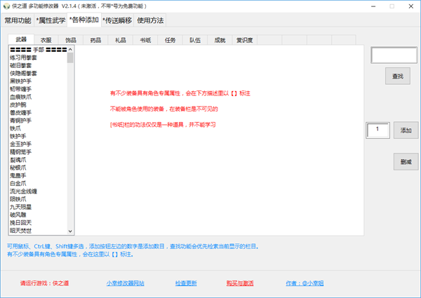 可用鼠标、CtrL键、Shift键多选,添加按钮左边的数字是添加数目,查找功能会优先检索当前显示的栏目。有不少装备具有角色专属属性,会在这里以【】标注。