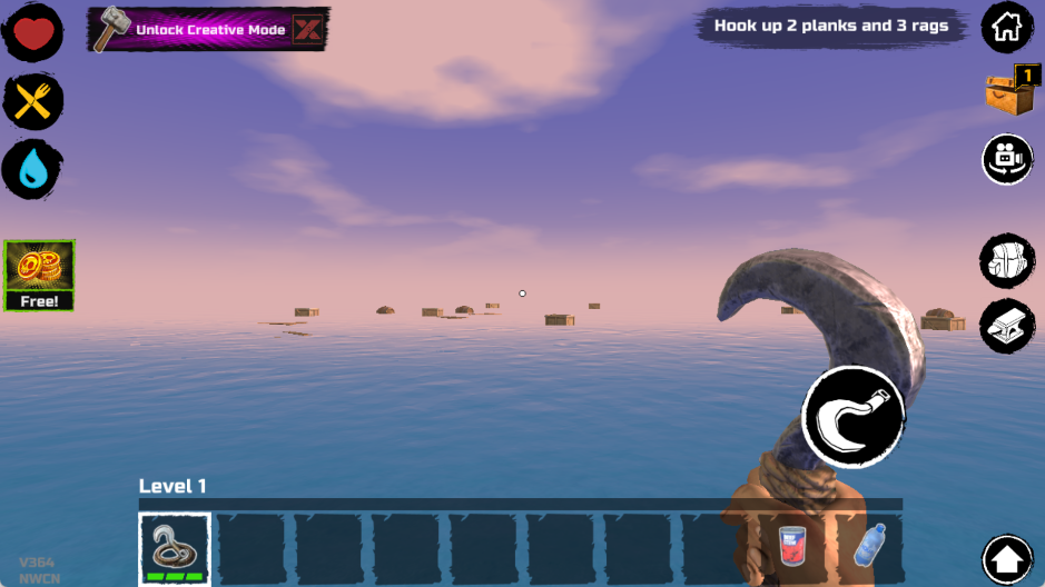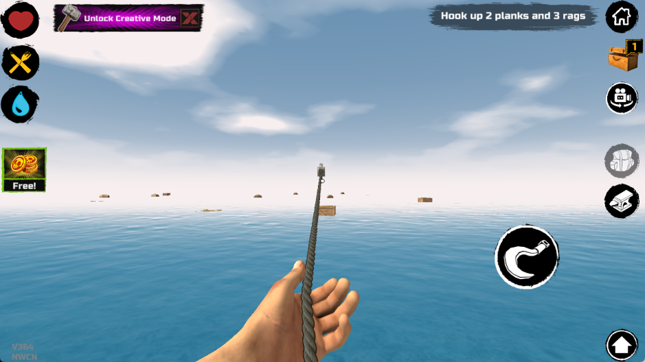最初的游戏阶段,你出生时只有一个小木板作为活动空间和一个钩子。鲨鱼会不定期来攻击你的木板,如果你选择不抵抗,它会不停地咬,直到把一块板子咬烂为止。所以,你必须尽快利用钩子收集资源。水上的资源大致分为四类: