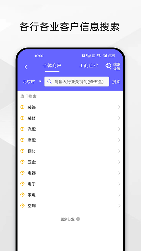 此外电销客源app还提供了搜客户、找客户、找客源、找人脉、找经销商、招代理、获客拓客、企业查询等丰富功能,同时提供各大城市的电销厂商、经销商和客户,丰富的数据库可以一键搜索,自动匹配,帮助轻松完成产品的销售和推广工作。