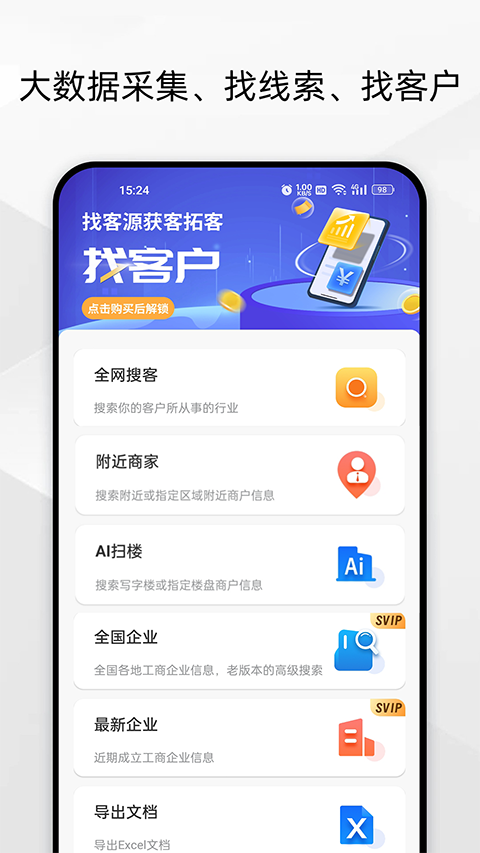 电销客源app是一款款专门为广大销售人员设计的电商获客软件,这款软件有着大数据搜索采集、找客户、找客源、获客、拓客等功能,并且它可以将收集到的客户数据导入到软件上,点击一下即可导入并进行保存,这样就能够让用户们更方便的练习与客户的交流以及更好的保存数据。另外软件内还有着各种搜索方式来让大家应对自如,以此有效提升寻找客源的效率轻松找到准确的客户。