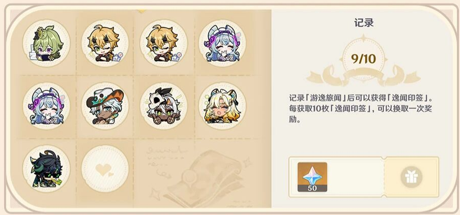 记录「游逸旅闻」后可以获得一枚对应角色的「逸闻印签」,每收集十枚「逸闻印签」可以获得原石奖励哦。