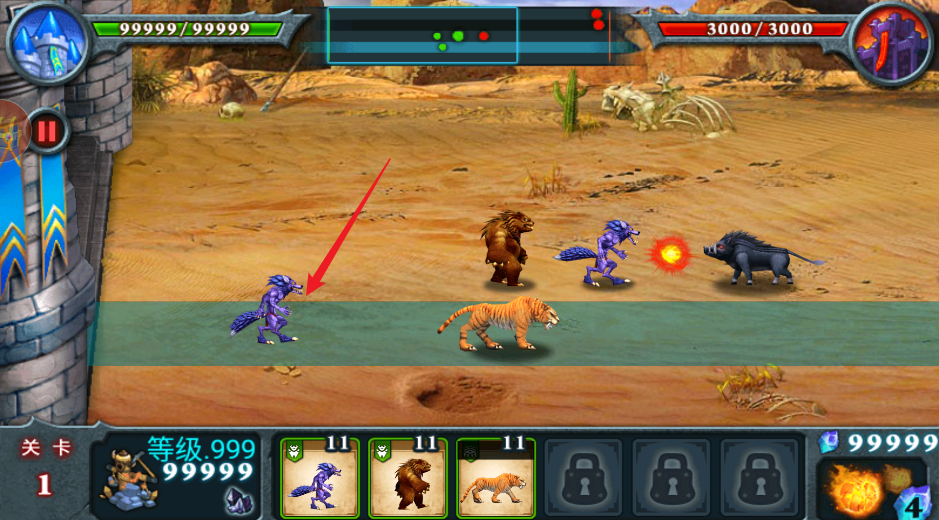 5、消耗资源后,将猛兽卡牌拖入战场,即可自动对敌发起攻击。