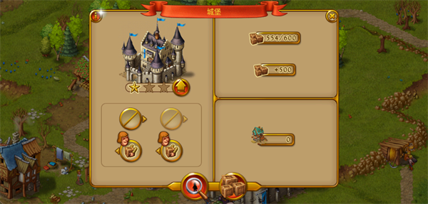 2、进入一个场景游戏后,你就会看到一个大的城堡,几个小房子、伐木小屋等。小房子提供人口,增加人口才能干活。