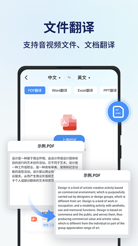 支持导入各类文件,如pdf、word、excel、ppt和txt等进行翻译,准确率高翻译速。
