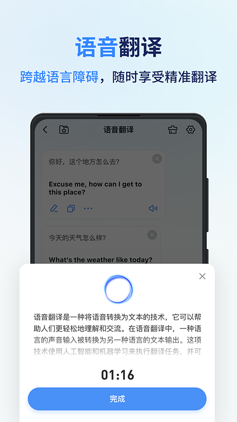 输入语音内容,实时语音翻译,智能翻译成您所需要的语言。