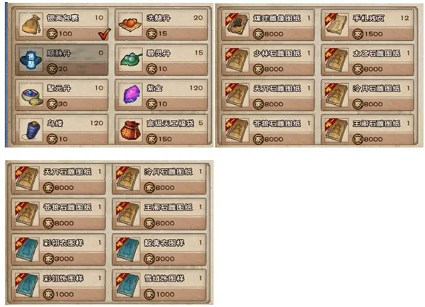 宝,附带耳房图纸)、庭院(1500元宝,附带耳房图纸+凉亭图纸)、府邸(3000元宝附带耳房图纸+凉亭图纸+游廊图纸)