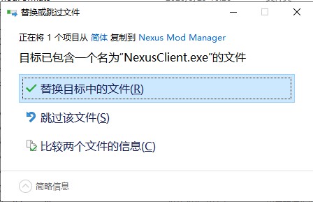 6、复制简体/繁体文件夹里面的NexusClient.exe到Nexus Mod Manager的安装目录进行覆盖。