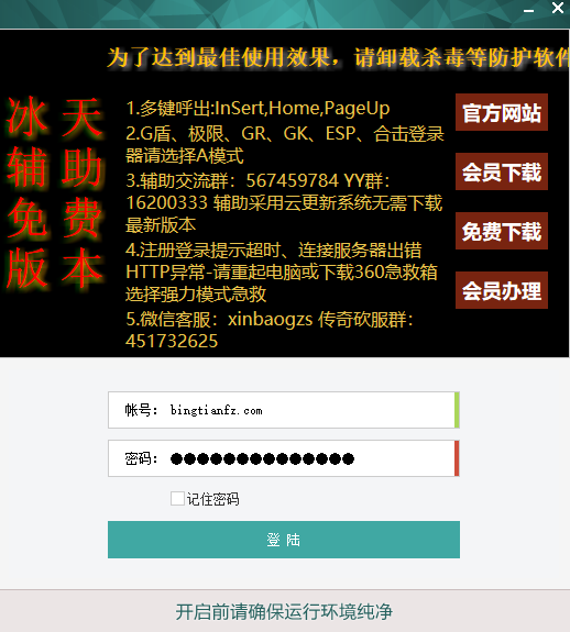 冰天辅助免费版是一款专门应用于传奇游戏的辅助工具,基本上支持所有的传奇类型游戏,具有加速功能,完全免费,不受IP的限制.....诸多特点,傻瓜式的操作,十分简单,不要学就会,而且页面也十分简洁,没有什么广告,是一个很不错的传奇辅助工具,用户只要有了它,无论用户在那里,只要有了电脑什么时候都能用哦,而且用户只需一键就能完全的智能化控制哦,用户无需待在电脑面前,它会一键帮你搞定......冰天辅助免费版采用智能过检测,全面支持市面上所有的登陆器(秒杀刀锋、GAMEM2、非凡、DEE凤天、无双、猎鹰、金盾、M6、巨牛、3KM2.飞翔、LEGEND-CD等主流登陆器版本)并独家采用云端技术更新,用户无需重复下载,自动更新