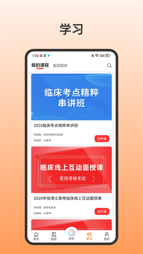 张博士医考掌上课堂app是中国协和医科大学医学博士张银合及其团队专为医学考生设计的一款备考应用,覆盖近10年真题+高频模拟题,解析深度剖析考点和命题逻辑。提供个性化学习计划,每天自动推送每日学习任务,根据用户的学习数据报告生成趋势图。全真模拟机考环境,模拟真实的考试体验,让你在真正的考试不再紧张,AI智能系统为你评分,将错题自动归类错题当中,这些错题类型将在每日推送中出现,帮助你巩固知识!