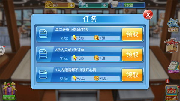 上方会显示游戏目标和时间限制,我们需要在规定的时间按照顾客的要求完成订单即可获得小费。