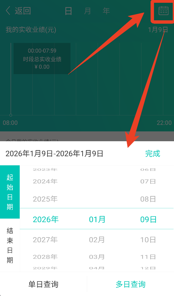 3、点击右上角日历图标可以自定义查询单日或多日业绩。