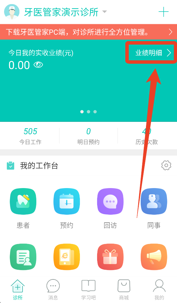 1、【诊所】这个页面的上方会显示你的业绩,点击右边的【业绩明细】可以查看更加详细的业绩记录。