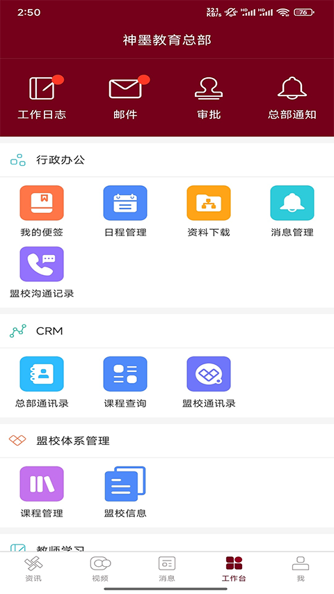 神墨教育,是神墨教育总部为盟校提供的定制化高效办公平台,其中资讯板块、总部职能与总部通讯录、课程查询、盟校通讯录、文件资料更是为盟校了解总部和查找其他盟校提供了方便,使盟校与总部有了高效的沟通与连接。