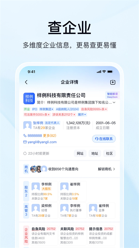 爱企查app是一款企业信息免费查询软件,该软件依托百度先进的AI和大数据技术,可以帮助用户快速了解企业状况,降低因信息壁垒带来的潜在风险,提升办公效率。除此之外,这款软件界面简洁,操作使用简单,可以提供实时的企业信息数据查询,包括实时查询企业相关的工商登记信息,年报,股东信息,投资人信息,涉诉,失信等,全方位满足用户的使用需求。与此同时,爱企查app还通过对企业监管、经营行为、市场反馈、关系网络等全面及时的专业解读,消除信息鸿沟,提升商业安全,让你对企业风险即时掌握,轻松了解实时企业信息。
