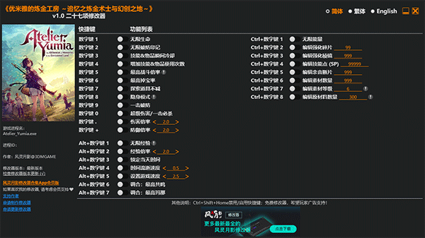 优米雅的炼金工房修改器是一款专为《优米雅的炼金工房》系列游戏打造的数值Mod辅助工具,支持二十七项游戏内修改。其核心功能丰富,资源修改可实现无限金钱、素材和调合次数,快速解锁稀有材料;角色强化能调整属性、技能熟练度,加速经验升级;时间控制可冻结或调整游戏时间,防止任务超时;调合辅助可一键合成高品质道具,解锁全配方。