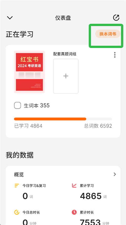 2、在【正在学习】一栏旁,点击【换本词书】。