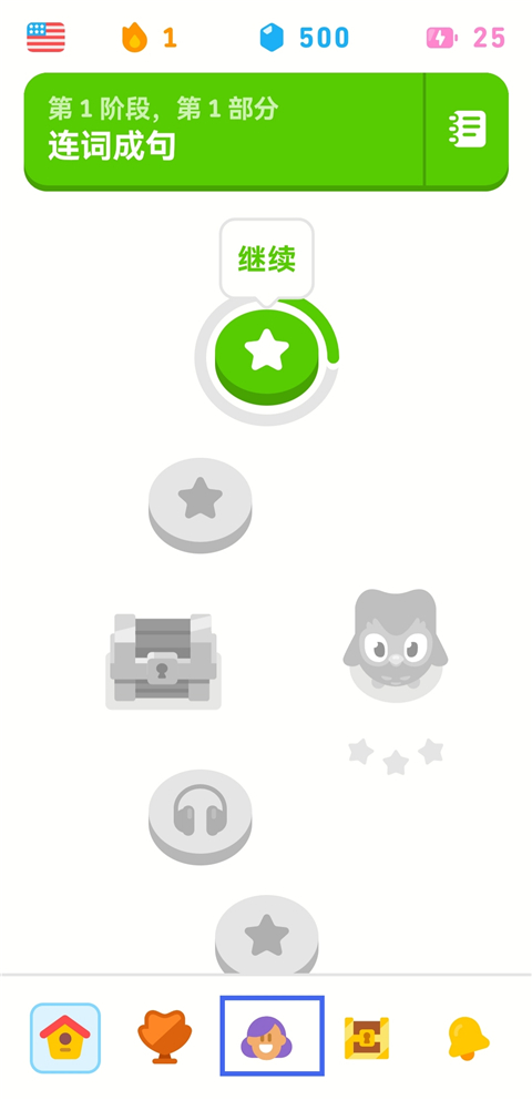 1、在多邻国首页面,点击左上角国旗图标。