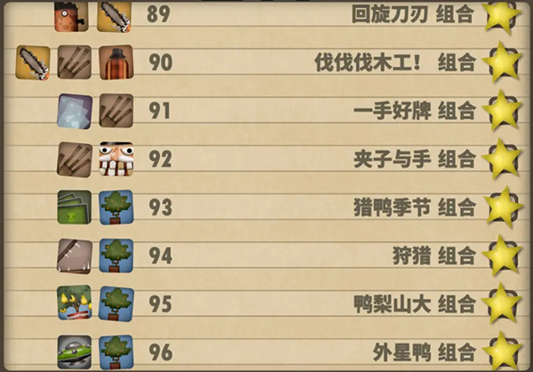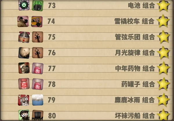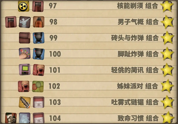 十、73—80组合:喷云吐雾链条组合:Drill Chain Thrower(6) PuffPack(6);致命恶习组合:Midlife Crisis Mitigator(3) Glass Cards(6) Puff Pack(6);注射组合:Snake Surprise(2) Protein Powder(6);健美组合:Manly Trophy(6) Protein Powder(6);震耳欲聋的组合:Valkyrie Doll (2) Sonic Boombox(6);狂飙组合:Wooden Bicycle(1) Celebration Bus(1) Mustache Rider(6);患病的组合:Toy Leperchaun(2) Mystery Seasoning(3) Book of Darkness(6)